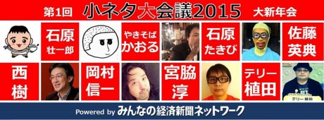 みんなの経済新聞ネットワークが東京カルチャーカルチャーで初企画イベントを開催。2014年の面白かった選りすぐりの小ネタを有名ライター陣が披露。出演者、イベント参加者全員で投票し「小ネタ大会議大賞」を決定、発表します!小ネタをアテに新年の乾杯をしましょう。出演者、ライターさんとの交流もお楽しみください。