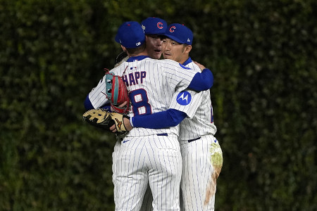 米大リーグのプレーオフ、ナ・リーグ地区シリーズ第4戦。カブスはブルワーズに6―0で勝って2勝2敗とし、決着を11日の第5戦に持ち込んだ。カブスの鈴木は5打数1安打。写真は喜ぶ鈴木(右)=9日、シカゴ 【ロイター時事】