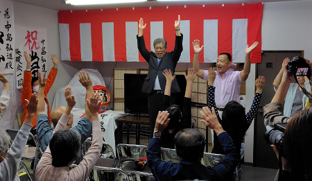静岡県伊東市議選(定数20)は19日投開票され、学歴詐称が指摘される田久保真紀市長への再度の不信任決議案について、賛成の意向を示す19人が当選した。写真は当選を決めた中島弘道前議長(中央奥)=同市 【時事通信社】