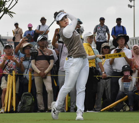 メイバンク選手権。第1ラウンドでティーショットを打つ山下美夢有。8バーディー、2ボギーの66をマークして4位につけた=30日、マレーシアのクアラルンプールG&CC 【時事通信社】