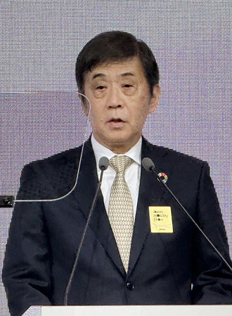 国内最大の自動車ショー「ジャパンモビリティショー」が30日、東京ビッグサイト(東京都江東区)で開幕した。写真は開幕式であいさつする日本自動車工業会の片山正則会長。 【時事通信社】