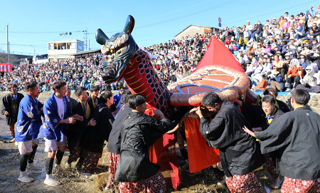 国連教育科学文化機関(ユネスコ)の無形文化遺産に登録されている八代妙見祭のハイライト、神幸行列が23日、熊本県八代市で行われた。亀と蛇が合体した想像上の動物「亀蛇(きだ)」や獅子舞などが町を練り歩いた 【時事通信社】
