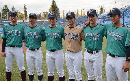 東京六大学野球連盟の結成100年記念試合が29日、神宮球場で行われた。写真は試合を終え、写真に納まる(右から)松下、小島、毛利、伊藤樹、大川、田和。 【時事通信社】