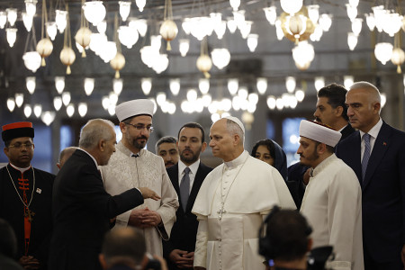 29日、トルコ最大都市イスタンブールのスルタンアフメットモスク(通称ブルーモスク)を訪れたローマ教皇レオ14世。教皇のモスク(イスラム礼拝所)訪問は5月の就任後初めて。 【AFP時事】