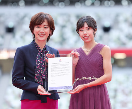日本陸連の年間表彰式が29日、東京・国立競技場で行われた。写真は最優秀選手賞に当たる「アスリート・オブ・ザ・イヤー」に輝いた藤井菜々子(右)。左は有森裕子会長=代表撮影 【時事通信社】