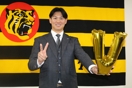 阪神の及川は7000万円増の1億円で更改。6年目で初めて開幕1軍で臨んだ今季は、66試合に救援登板して6勝3敗1セーブ、46ホールド、防御率0.87。(金額は推定)=3日、兵庫県西宮市 【時事通信社】