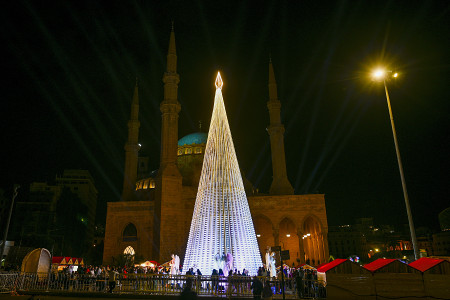 7日、レバノンの首都ベイルートにあるモスク(イスラム礼拝所)の前で点灯されたクリスマスツリー。イスラム教徒が多数を占める中東で、レバノンは18の宗教・宗派が共存していることで有名だ。 【EPA時事】