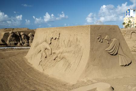 15日、スペイン・カナリア諸島の砂浜に展示されているのは聖書の場面を表現した砂の彫刻。クリスマスに合わせて制作され、来年1月上旬まで観覧できる。 【EPA時事】