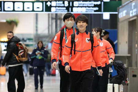 ミラノ・コルティナ五輪のスピードスケート日本代表が1月31日、合宿先のドイツからミラノ・マルペンサ空港に到着した。写真は森重航(中央)と新濱立也(左)ら。 【時事通信社】
