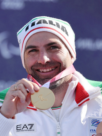 ミラノ・コルティナ・パラリンピック。スノーボードクロス男子の下肢障害LL2で金メダルを獲得したイタリアのエマヌエル・ペラトナー=8日、コルティナダンペッツォ 【時事通信社】