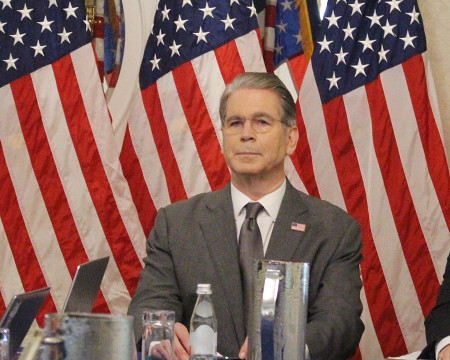 ベセント米財務長官は14日、時事通信を含む一部記者団の取材に応じ、連邦準備制度理事会(FRB)の金融政策運営について「利下げを行う前に様子見することもできる」との認識を示した=ワシントン 【時事通信社】