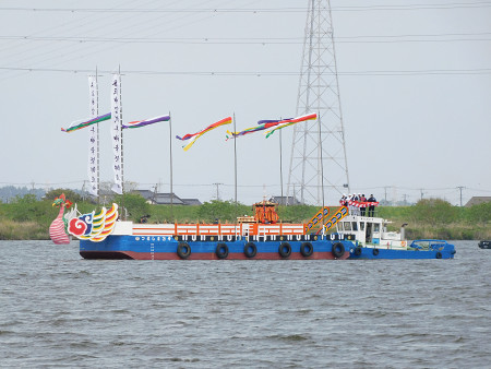 千葉県香取市の香取神宮の式年神幸祭が15日、始まった。午(うま)年だけに行われる盛大な祭典で、同神宮近くの利根川では、12年ぶりとなる御座船の巡行を見ようと大勢の見物客が集まった。祭典は16日まで。 【時事通信社】