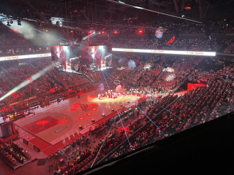 第2クオーター(Q)は、ゴール下でジョシュ・ホーキンソン選手がゴール下で体を張り、田中大貴選手はプレッシャーをかけてミスを誘発。ハーパージュニア選手がリバウンドでつないだボールを田中選手が得意のミドルで沈め、ジョシュ・ホーキンソン選手がリバウンドからの得点で同点に追いつく。しかし、同Q後半はミスもあり得点が停滞し、39-52と点差を広げられた。