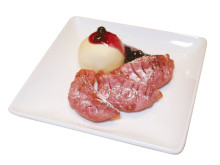 「ひとくち餃子パイ」(580円)は、ギョーザの皮をパイ生地に見立てる。味は2種類を用意。チョコフランボワーズ味は、ココアを練り込んだ皮でチョコレートとフランボワーズソース、マシュマロを包む。ブルーベリーチーズ味は、ピンク色の皮でクリームチーズとブルーベリーソースを包む。いずれも、ギョーザと同じ形で包んだ見た目で、アイスクリーム「雪見だいふく」を添えて提供する。