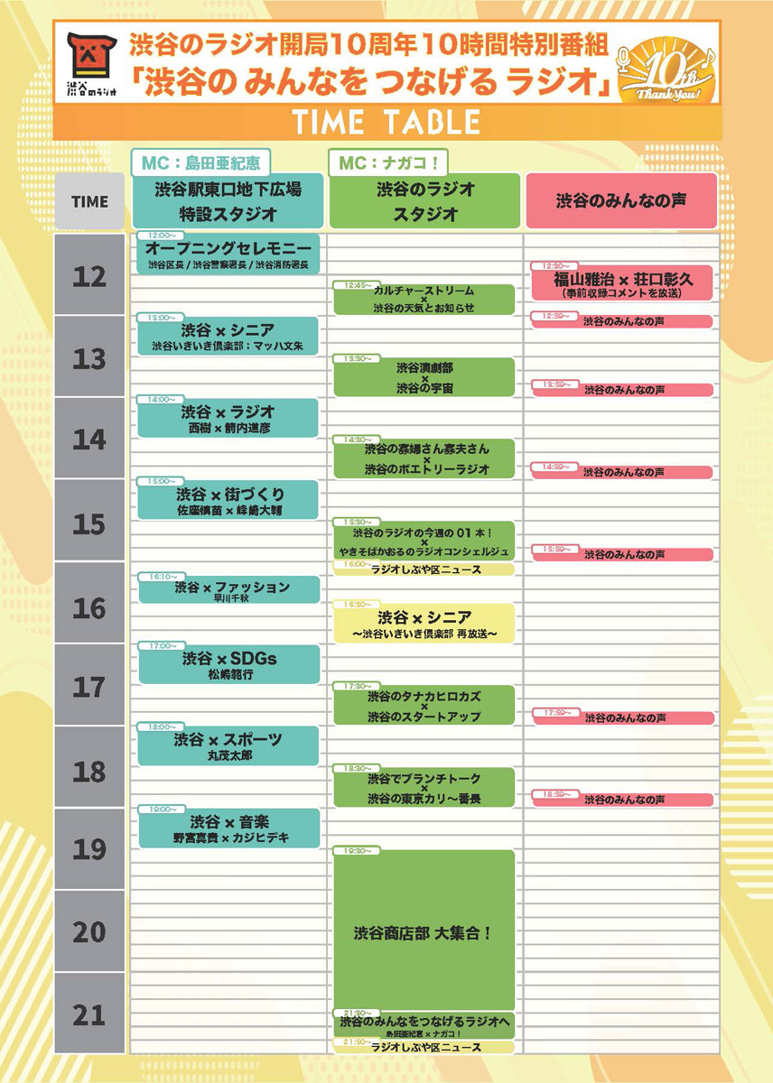 生特番のタイムテーブル=渋谷のラジオ、10周年記念で10時間生特番