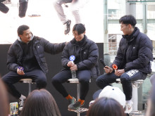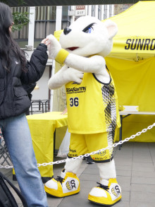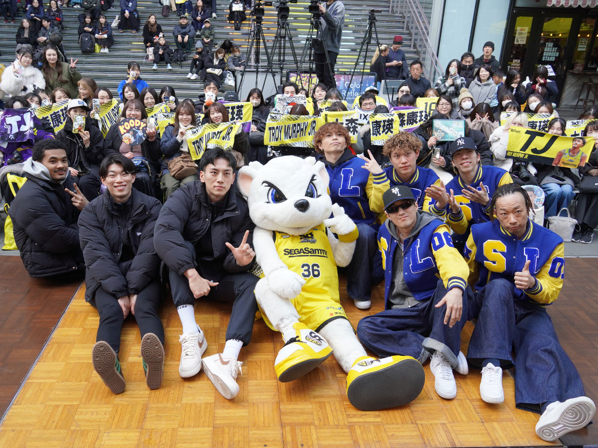 来場者と記念撮影も=サンロッカーズ渋谷、渋谷ストリームでトークショー
