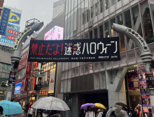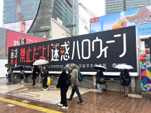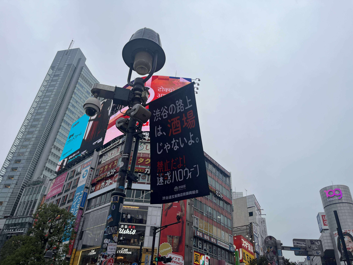 迷惑行為禁止を呼びかけるフラッグ=渋谷・宮下公園、ハロウィーン当日は15時閉園へ