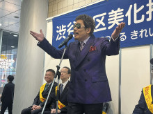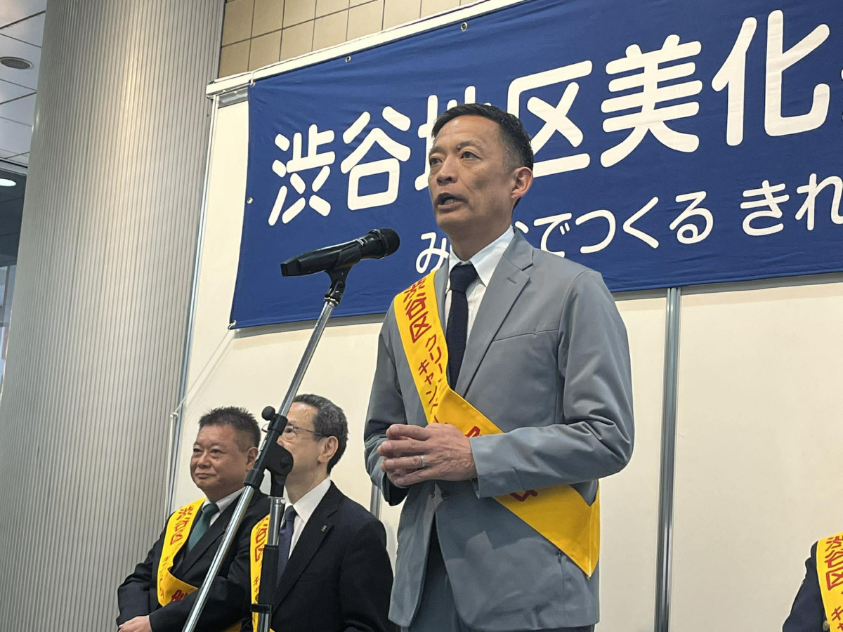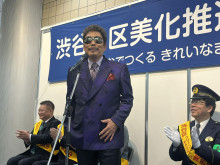 セレモニーであいさつする長谷部健渋谷区長=鈴木雅之さん、渋谷駅前で「渋谷で5時」披露