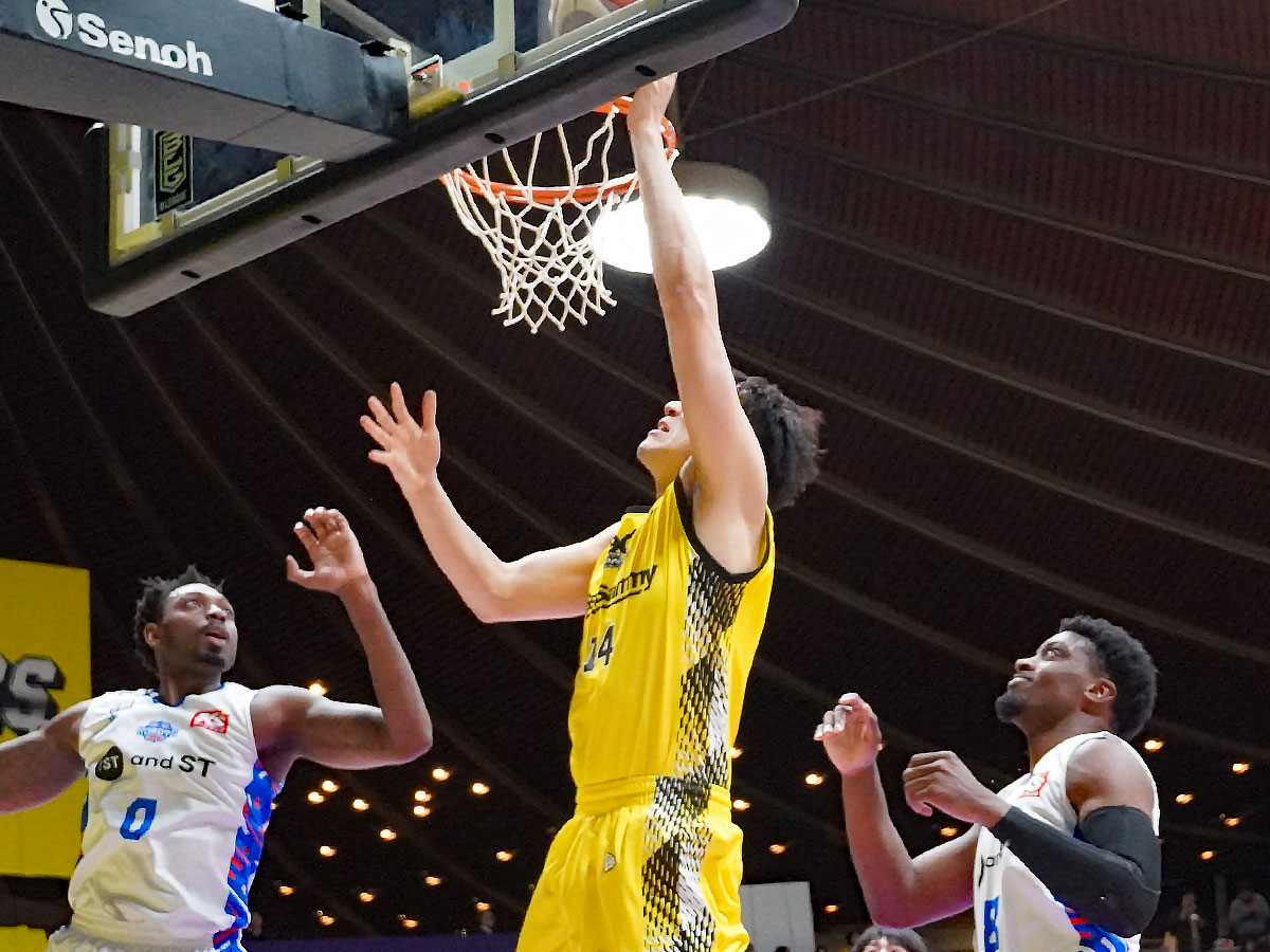 ゴール下で得点を挙げた狩野富成(中央)=サンロッカーズ渋谷、茨城下し5連勝