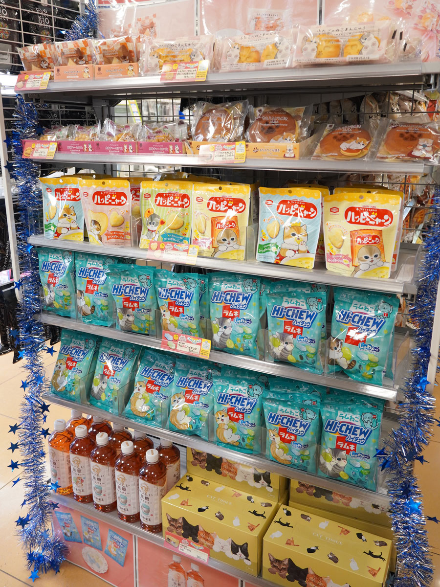 猫をモチーフにした商品などが並ぶ一角=ファミマ、渋谷・キャットストリート店で保護猫写真展
