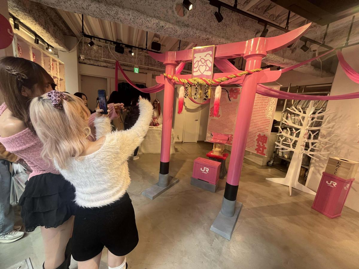 ピンク色の鳥居やさい銭箱に、尻尾付きのはかま――渋谷センター街に2月12日、「ギャル巫女(みこ)」たちが「バイブス、アゲ~!」とおはらいする「ギャル神社」が期間限定でオープンした。