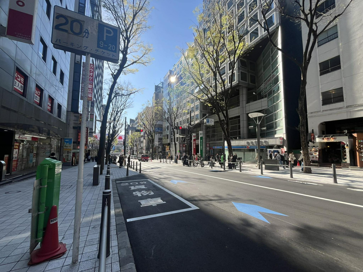 坂の上からの景色=渋谷・宮益坂の道路工事が一部完了