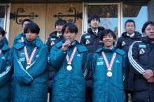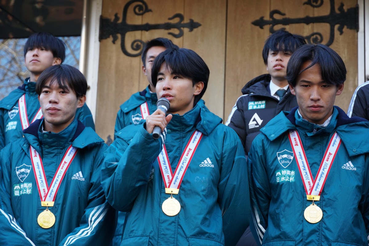「第102回箱根駅伝」で9度目となる総合優勝を3連覇で決めた青山学院大学が1月8日、青山キャンパス(渋谷区渋谷4)で優勝報告会を開き、原晋監督や優勝の立役者となった4年で主将の黒田朝日選手らが出席した。
