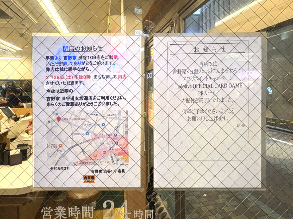 閉店を知らせる張り紙=渋谷・道玄坂下の「吉野家」が閉店へ