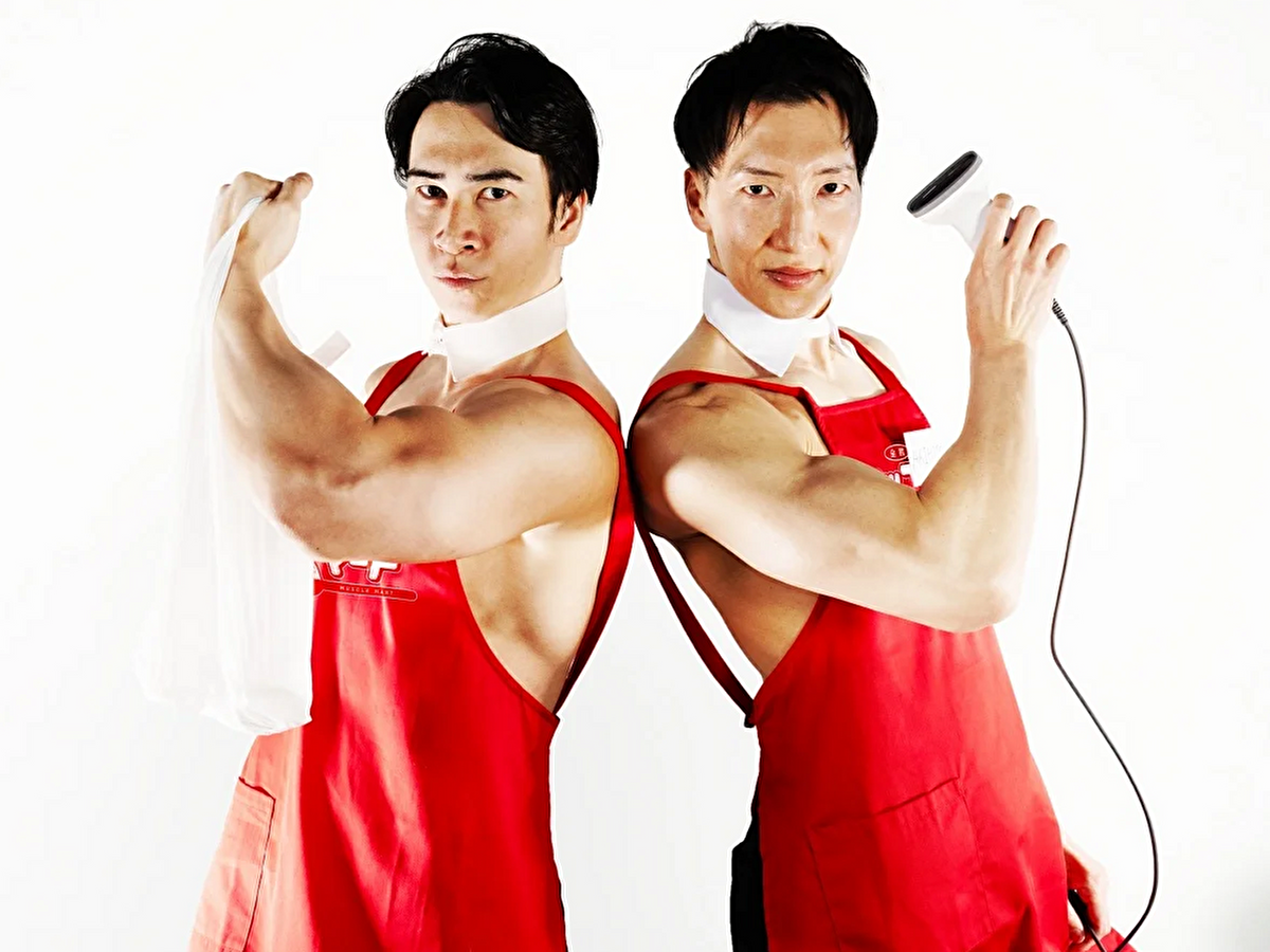 店員として働く筋肉質の男性パフォーマンス集団「ALLOUT」のイメージ=渋谷に限定コンビニ「マッスルマート」