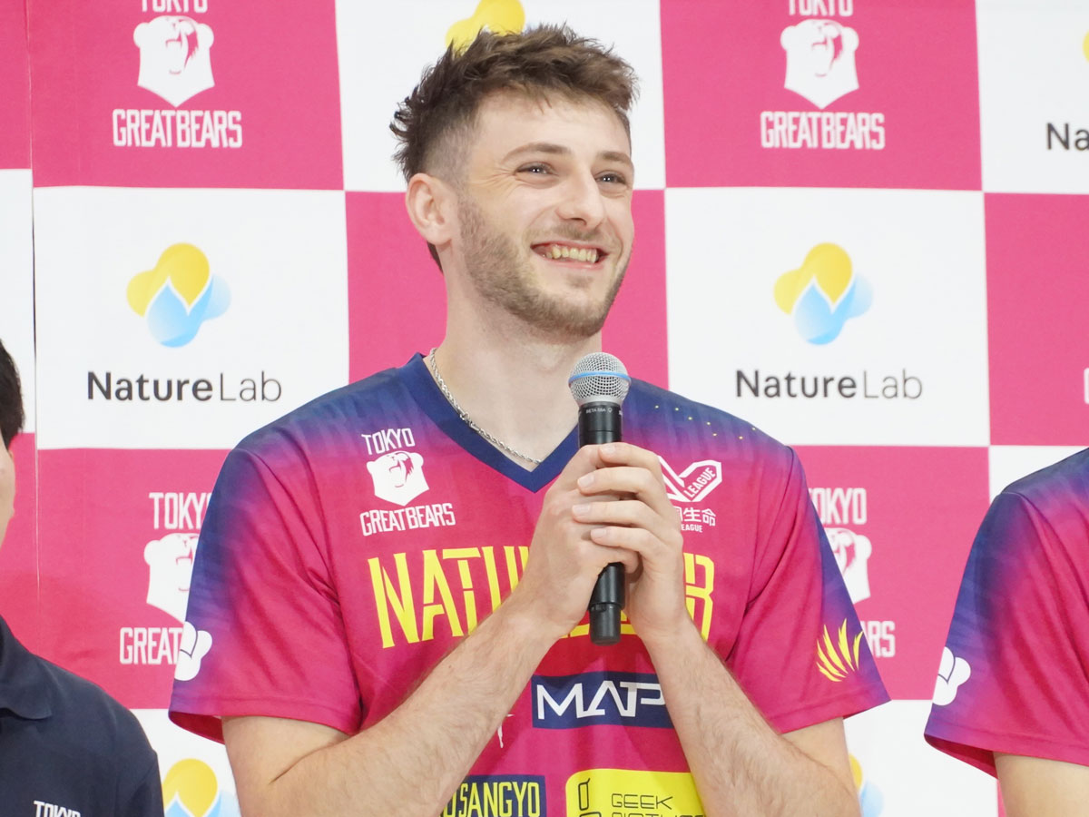 「できるだけ日本のを習得したい」と日本語でもあいさつしたスロベニア代表のヤン・コザメルニク選手=東京グレートベアーズ、新チームお披露目