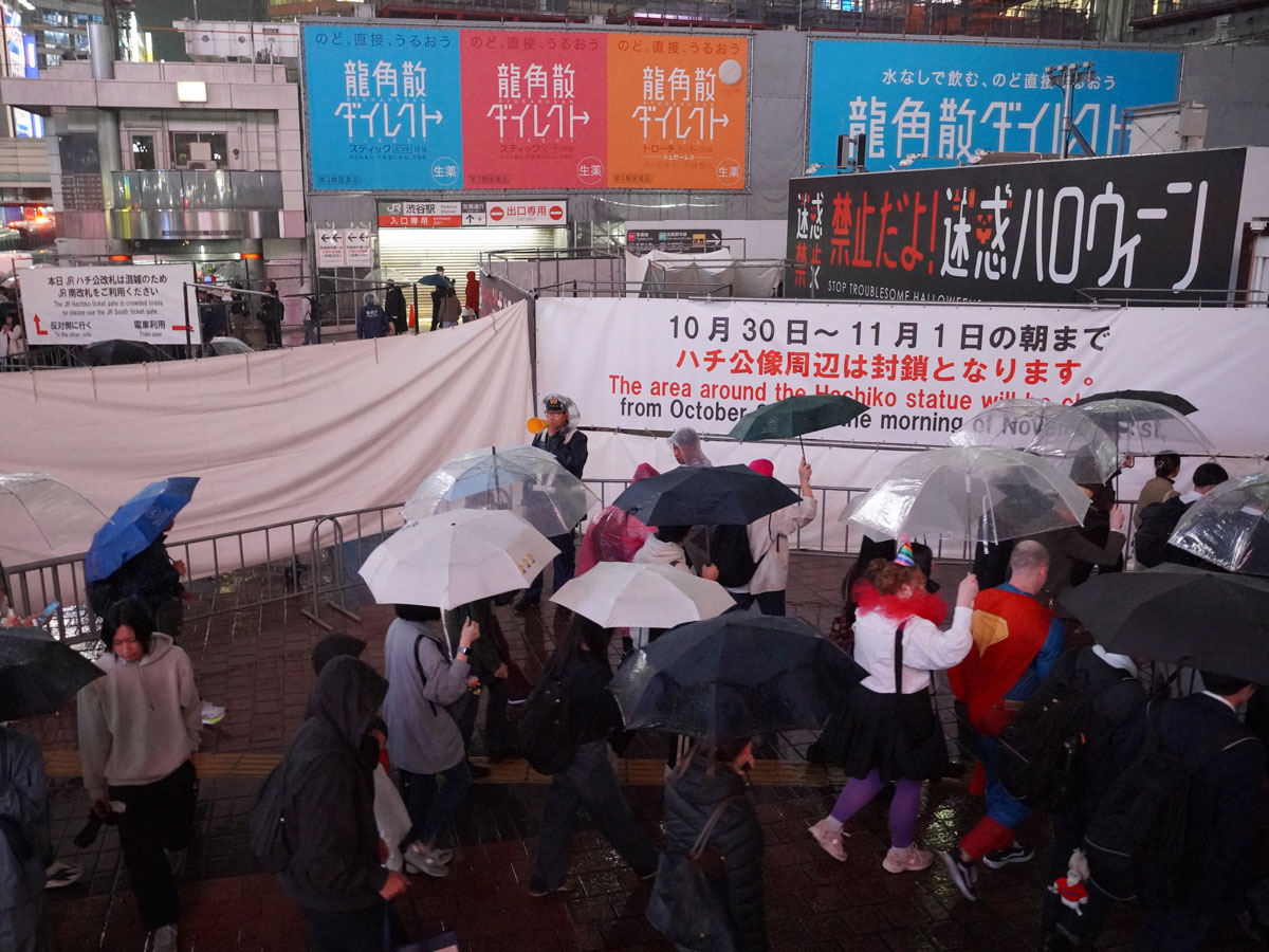 ハロウィーン当日の10月31日夜を迎えた渋谷駅周辺は、雨の影響もあり混乱などは見られていない。