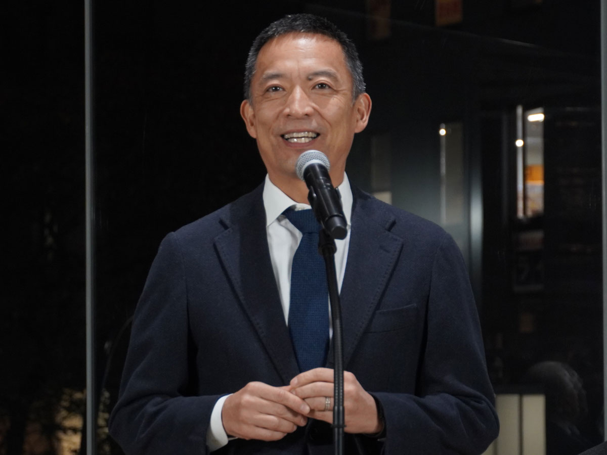 点灯式に参加した長谷部健渋谷区長=渋谷・桜丘町「さくら坂」でピンク色のイルミネーション