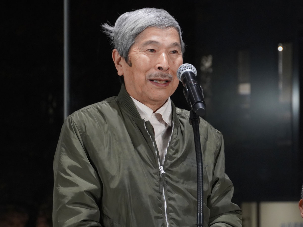 点灯式に参加した渋谷駅前共栄会の青山強志会長=渋谷・桜丘町「さくら坂」でピンク色のイルミネーション