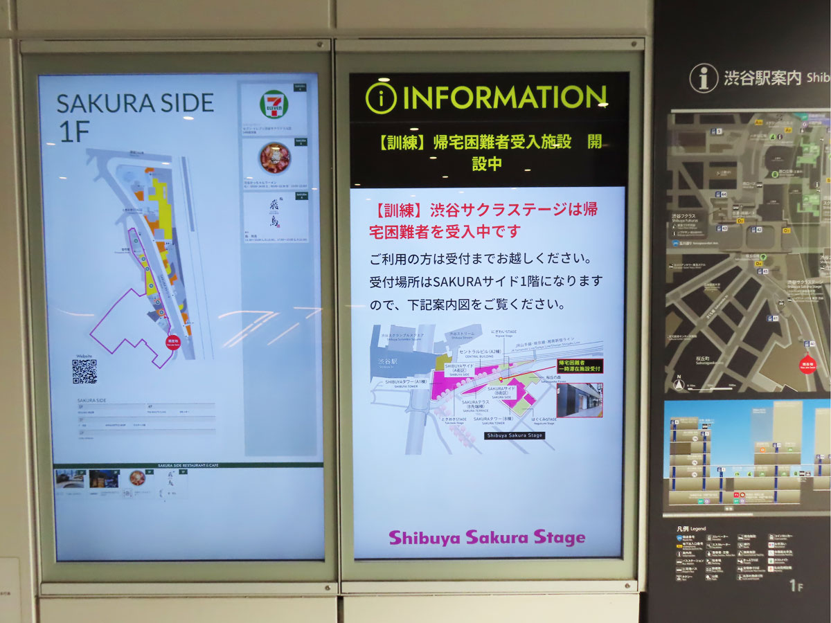 帰宅困難者の受付を案内した渋谷サクラステージのサイネージ=渋谷サクラステージで帰宅困難者対策の訓練