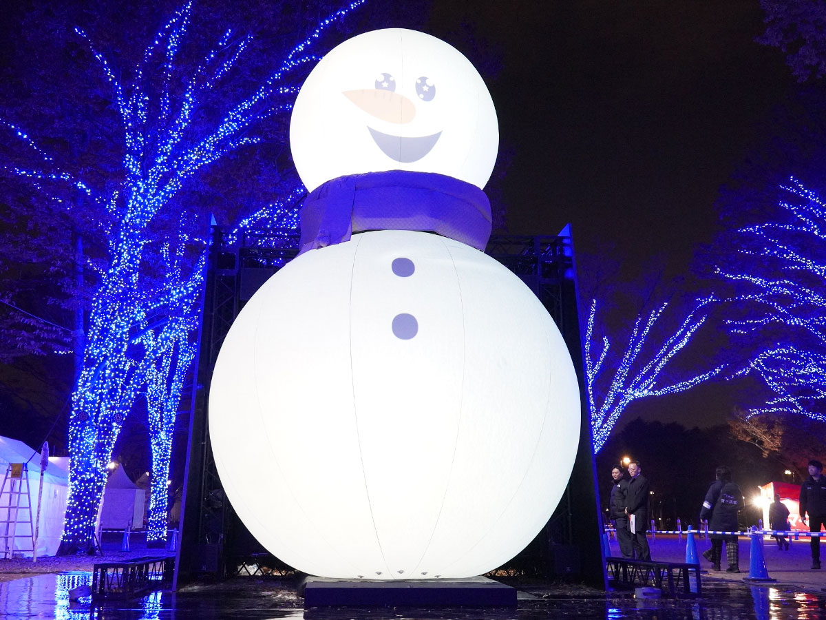 6メートルを超すスノーマン型のバルーン=渋谷でイルミネーション「青の洞窟」点灯式