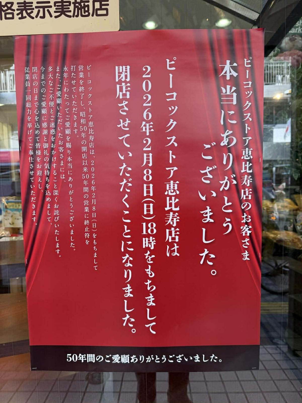 閉店を知らせるポスター=「ピーコックストア恵比寿店」閉店へ