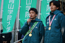「第102回箱根駅伝」で9度目となる総合優勝を3連覇で決めた青山学院大学が1月8日、青山キャンパス(渋谷区渋谷4)で優勝報告会を開き、原晋監督や優勝の立役者となった4年で主将の黒田朝日選手らが出席した。