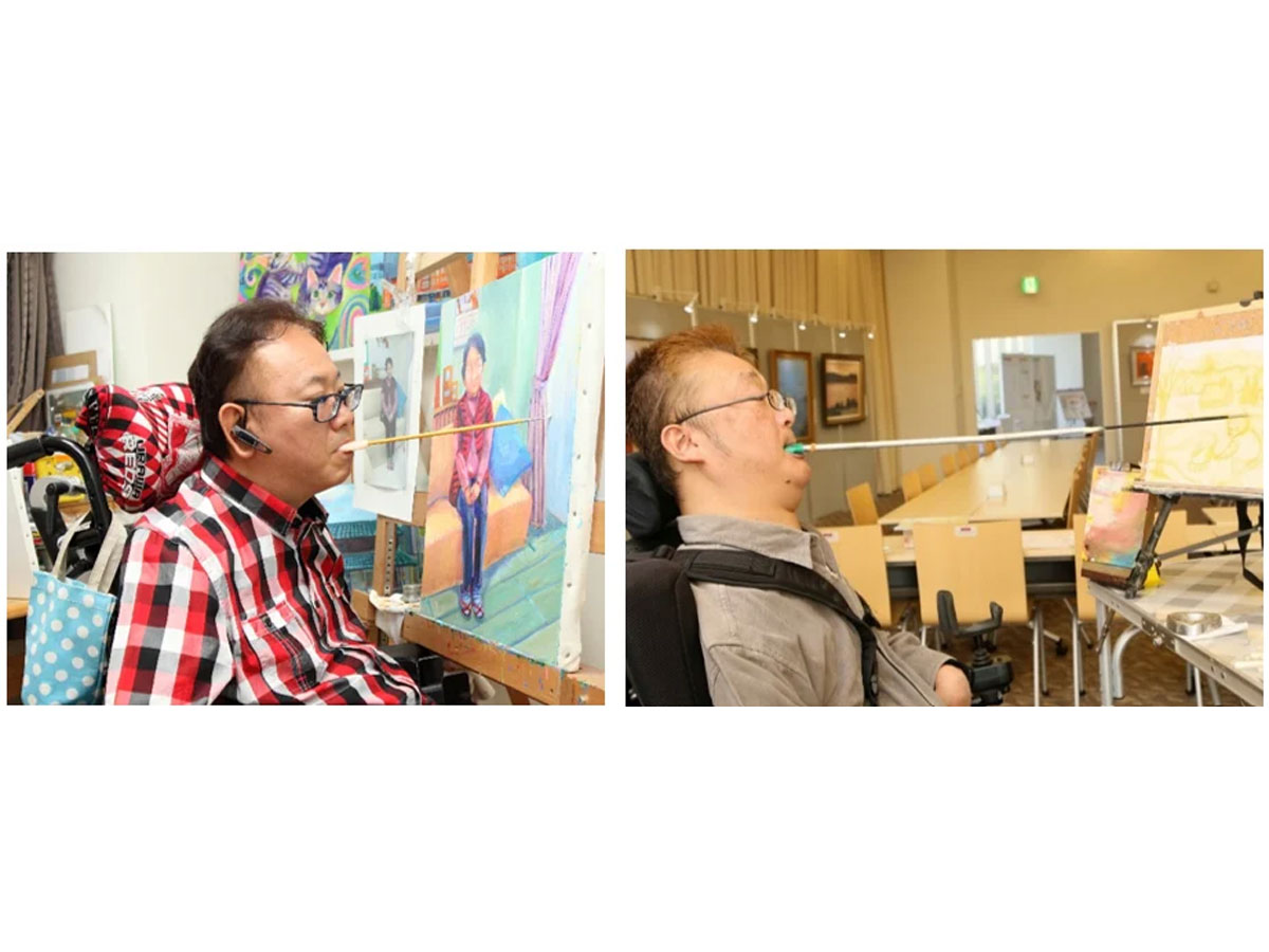 会期中に実演を予定する(左から)梅宮俊明さんと古小路浩典さん=渋谷で口と足で描く画家の絵画展
