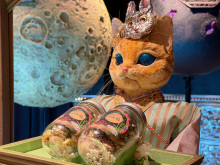 商品を運ぶ猫のからくり人形=代々木上原の和洋菓子店「小楽園」でバレンタイン企画 「天球」チョコを採掘