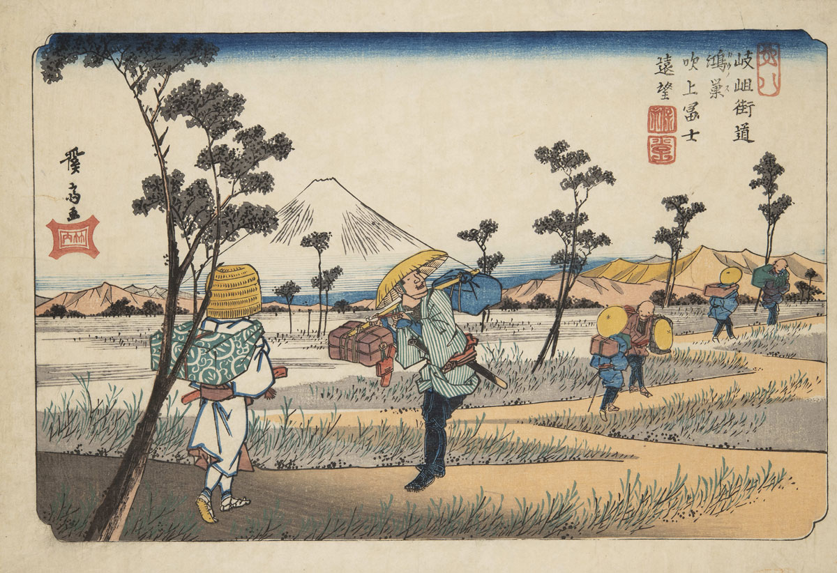 上空を見上げるおじさんが描かれている渓斎英泉「岐岨街道 鴻巣吹上冨士遠望」=原宿の浮世絵専門美術館で「浮世絵おじさんフェスティバル」