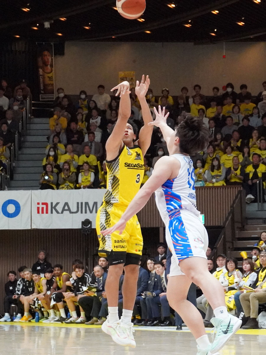 終盤に3ポイントシュートを決めたジャン・ローレンス・ハーパージュニア選手(奥)=サンロッカーズ渋谷、茨城下し5連勝