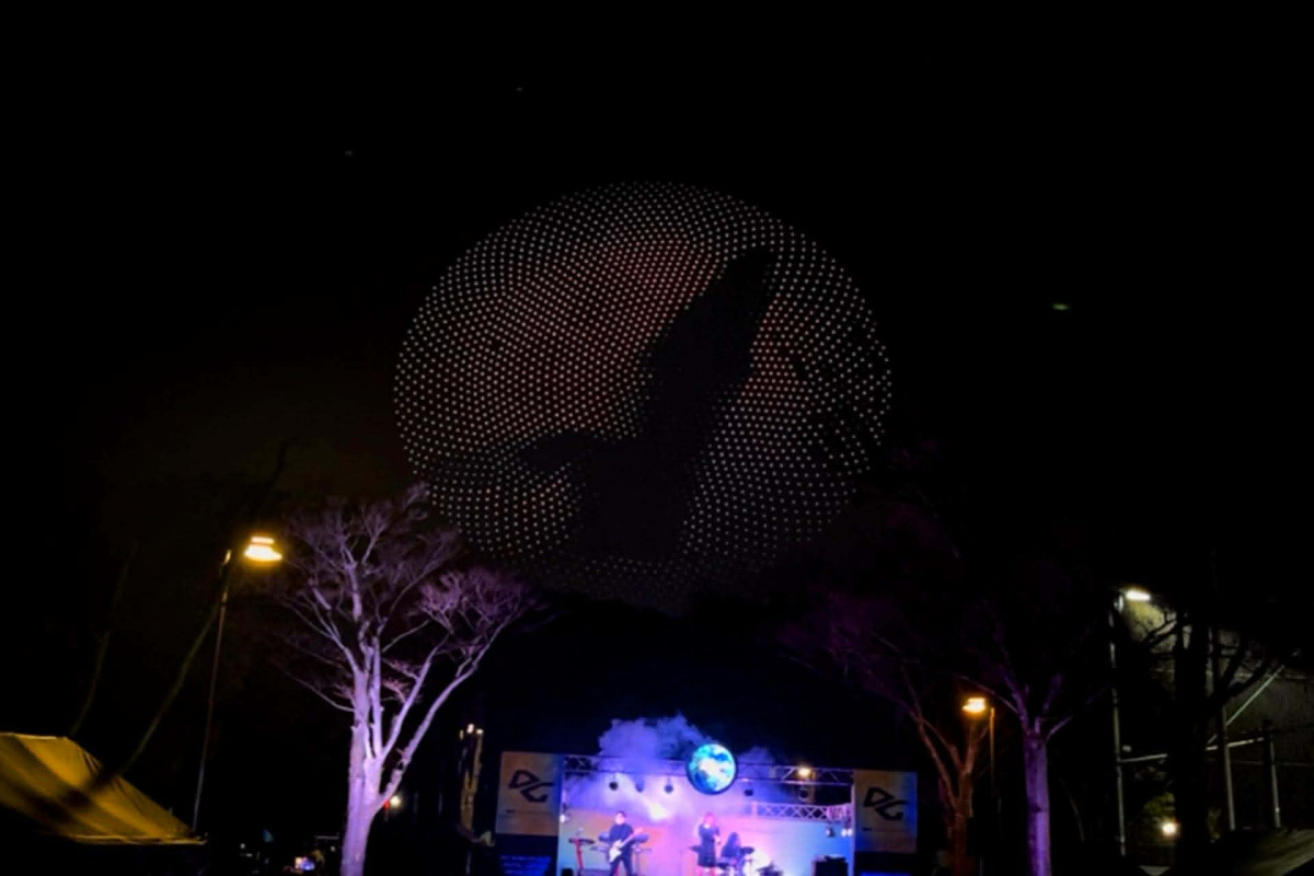 地球の中に浮かび上がるクジラ=渋谷の上空で3030機のドローンショー