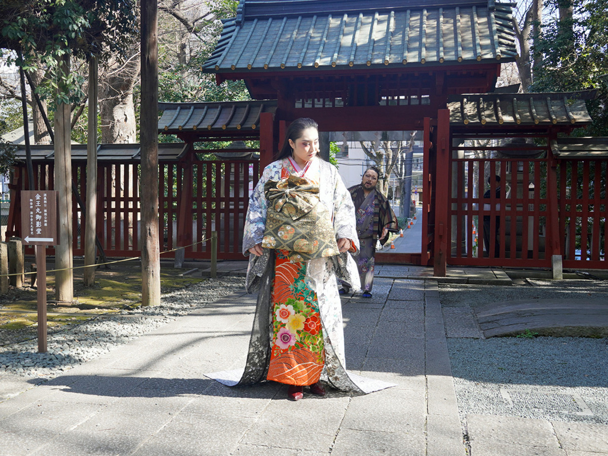 神門付近でのシーン=金王八幡宮でイマーシブオペラ「KABUKI×パリアッチ」