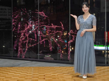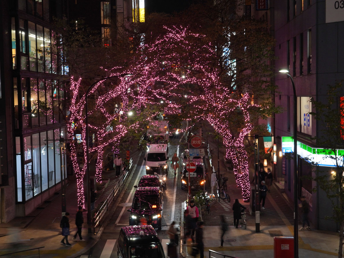 駅西口歩道橋デッキから臨む「さくら坂イルミネーション」=渋谷・桜丘町「さくら坂」でピンク色のイルミネーション