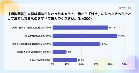 当初は興味がなかったキャラクターを、後から「好き」になったきっかけとしては、「性格や背景に惹かれたから」が45.0%で最多でした。