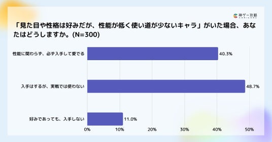 ・「見た目や性格は好みだが、性能が低く使い道が少ないキャラ」は「入手はするが、実戦では使わない」(48.7%)