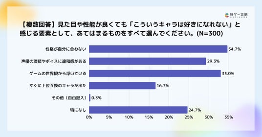 見た目や性能が良くても「こういうキャラは好きになれない」と感じる要素としては、「性格が自分に合わない」が34.7%で最多でした。