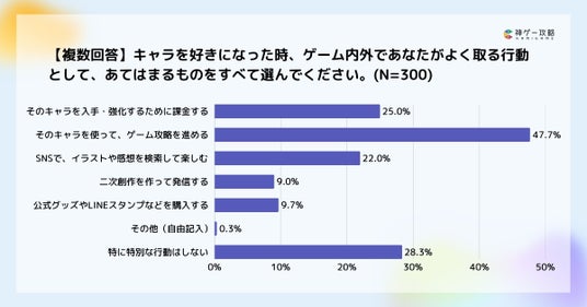 次いで、「特に特別な行動はしない」が28.3%、「そのキャラを入手・強化するために課金する」が25.0%、「SNSで、イラストや感想を検索して楽しむ」が22.0%となりました。「公式グッズやLINEスタンプなどを購入する」は9.7%、「二次創作を作って発信する」は9.0%、「その他」は0.3%でした。